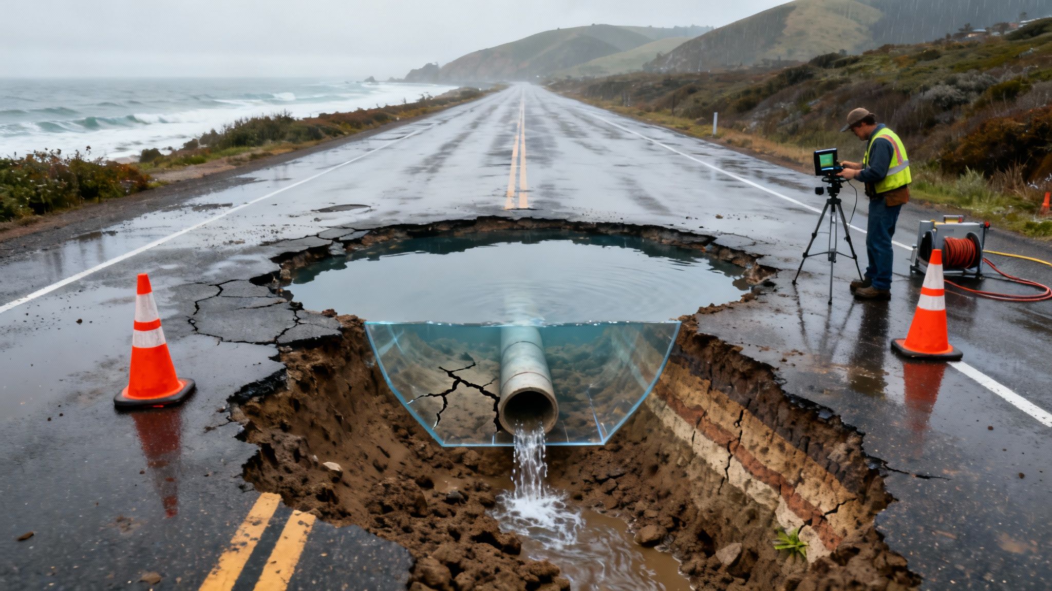 Imagine winter rain seeping into small cracks in the asphalt. At the same time, a leaky pipe below is washing away soil, creating a hidden empty space. The roadbed eventually sinks into that space, and the pavement cracks under the weight of traffic.